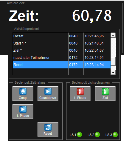 Über das Bedienpult Lichtschranken können alle Lichtschranken freigeschaltet werden. Zusätzlich können Sie im integrierten Aktivitätsprotokoll jeden Lichtschrankenimpuls nachverfolgen und aktivieren. Auch ein manuelles Starten und Stoppen der Zeit ist über das Bedienpult Zeitnahme möglich.