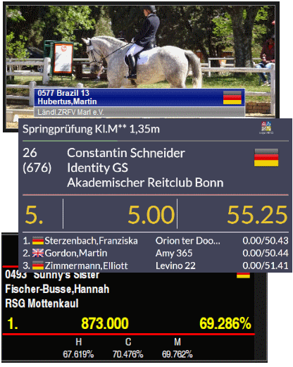Dabei können Sie direkt aus equiCONTROL heraus bestimmen, welches Informationssystem welche Daten anzeigen soll. So werden Sie mit nur wenigen Klicks zum eigenen Regisseur Ihrer Veranstaltung. Natürlich ist auch die einfache Einbindung von Sponsoren- und Veranstaltungslogos, bis hin zu einem komplett individuellen Design der Anzeigen möglich.